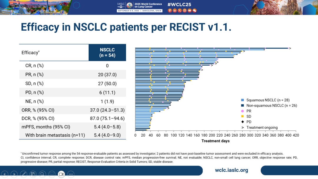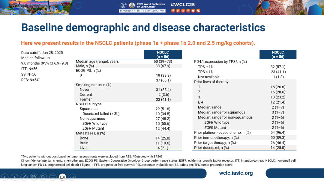 - 截至數據截止日期2025年6月28日,共計56例NSCLC患者入組Ia期及Ib期2.0和2.5 mg/kg劑量組,其中29例(51.8%)為鱗狀,27例(48.2%)為非鱗狀。鱗狀NSCLC中,10例(34.5%)患者經多西他賽治療失敗。非鱗狀NSCLC中,EGFR野生型/突變患者分別為15例(55.6%)及12例(44.4%)。