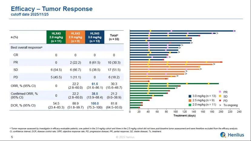 截至數據截止日期2025年11月25日,共有37名患者隨機分組並接受HLX43治療,劑量分別為2 mg/kg(n = 12)、2.5 mg/kg(n = 12)和3 mg/kg(n = 13)。大多數患者的ECOG PS評分為1(86.5%)。既往抗腫瘤治療線數中位數為2(範圍,1–4)。全部患者(100%)接受過化療及免疫治療,27.0%的患者接受過靶向治療,CPS≥1患者佔75.7%,中位隨訪時間為3.5個月。