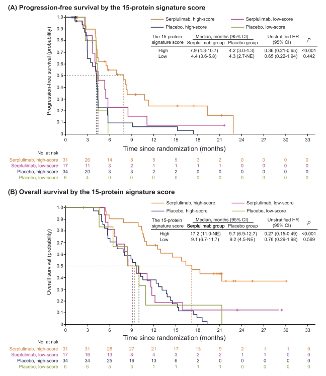 至2022年6月13日数据截止时,在意向治疗人群中,斯鲁利单抗组和安慰剂组的中位OS分别为15.8个月和11.1个月(HR 0.62;95% CI: 0.50-0.76;描述性P < 0.001)。通过比较斯鲁利单抗组中达到客观缓解和未达客观缓解的患者的血清蛋白质组,鉴定出181个DEPs,并由此构建了基于15个蛋白表达水平的分子标志物组合(15-蛋白标志物组合)。研究结果显示,在斯鲁利单抗组中,较高的15-蛋白标志物组合评分与更长的OS和PFS显著相关(见下图)。此外,携带RB1基因突变或Notch通路突变的患者,与携带对应的野生型基因的患者相比,获得ORR、OS或PFS改善。基线中性粒细胞与淋巴细胞比值(NLR)和乳酸脱氢酶(LDH)水平则是ES-SCLC患者的独立预后因素。