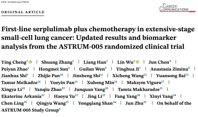 近日,复宏汉霖自主研发的抗PD-1单抗H药 汉斯状®(斯鲁利单抗,欧洲商品名:Hetronifly®)一线治疗广泛期小细胞肺癌(ES-SCLC)的国际多中心III期临床试验ASTRUM-005的更新数据和探索性生物标志物分析数据发表于期刊Cancer Communications (最新影响因子:20.1)。ASTRUM-005的牵头主要研究者为吉林省肿瘤医院程颖教授,该研究结果于2022年ASCO年会上首次发布,并于2022年9月登顶全球四大顶级医学期刊之一的《美国医学会杂志》(JAMA)。近日在ASCO 2025大会上,ASTRUM-005研究发布了中位随访42.4个月的分析数据,并首次公布四年OS率21.9%。此次发表于Cancer Communications的为截至2022年6月13日的ASTRUM-005研究更新数据和探索性生物标志物分析成果,分别已于2022年欧洲肿瘤学会亚洲分会(ESMO Asia)年会和2024年美国癌症协会年会(AACR 2024)上首次发布。