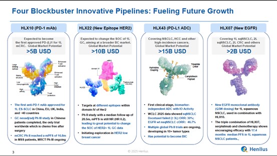 其中,H药已在英国、德国、新加坡、印度等国家和地区获批上市,美国桥接研究(ASTRIDE)亦已完成全部入组,为未来向美国食品药品监督管理局(FDA)递交生物制品许可申请(BLA)奠定基础。HLX43已获中、美、澳等多国临床许可,目前已在中、美两国完成首例受试者给药,并获得FDA孤儿药资格认定用于胸腺上皮肿瘤的治疗。HLX22头对头对比一线标准疗法(曲妥珠单抗+化疗±帕博利珠单抗)治疗胃癌的国际多中心III期临床目前于中澳美韩及拉美等国家和地区稳步推进,并获得FDA与欧盟委员会(EC)的孤儿药资格认定,全球开发前景广阔。HLX07联合H药的治疗方案在EGFR高表达鳞状非小细胞肺癌人群中展现出独特的临床潜能,为推动肺癌精准治疗带来了新的希望。