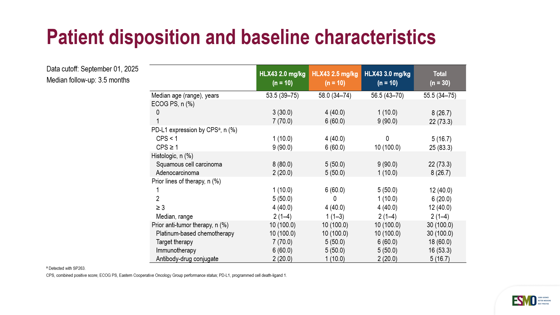 截至2025年9月1日,本研究共纳入30例患者,随机分配接受剂量为2 mg/kg(n=10)、2.5 mg/kg(n=10)和3 mg/kg(n=10)的HLX43治疗。其中超过80%的患者PD-L1综合阳性评分(CPS)≥1。 患者既往接受肿瘤治疗的中位线数为2.0(范围1–4线)。全部患者接受过铂类药物化疗,60%的患者接受过靶向治疗,约50%患者接受过免疫治疗,中位随访时间为3.5个月。