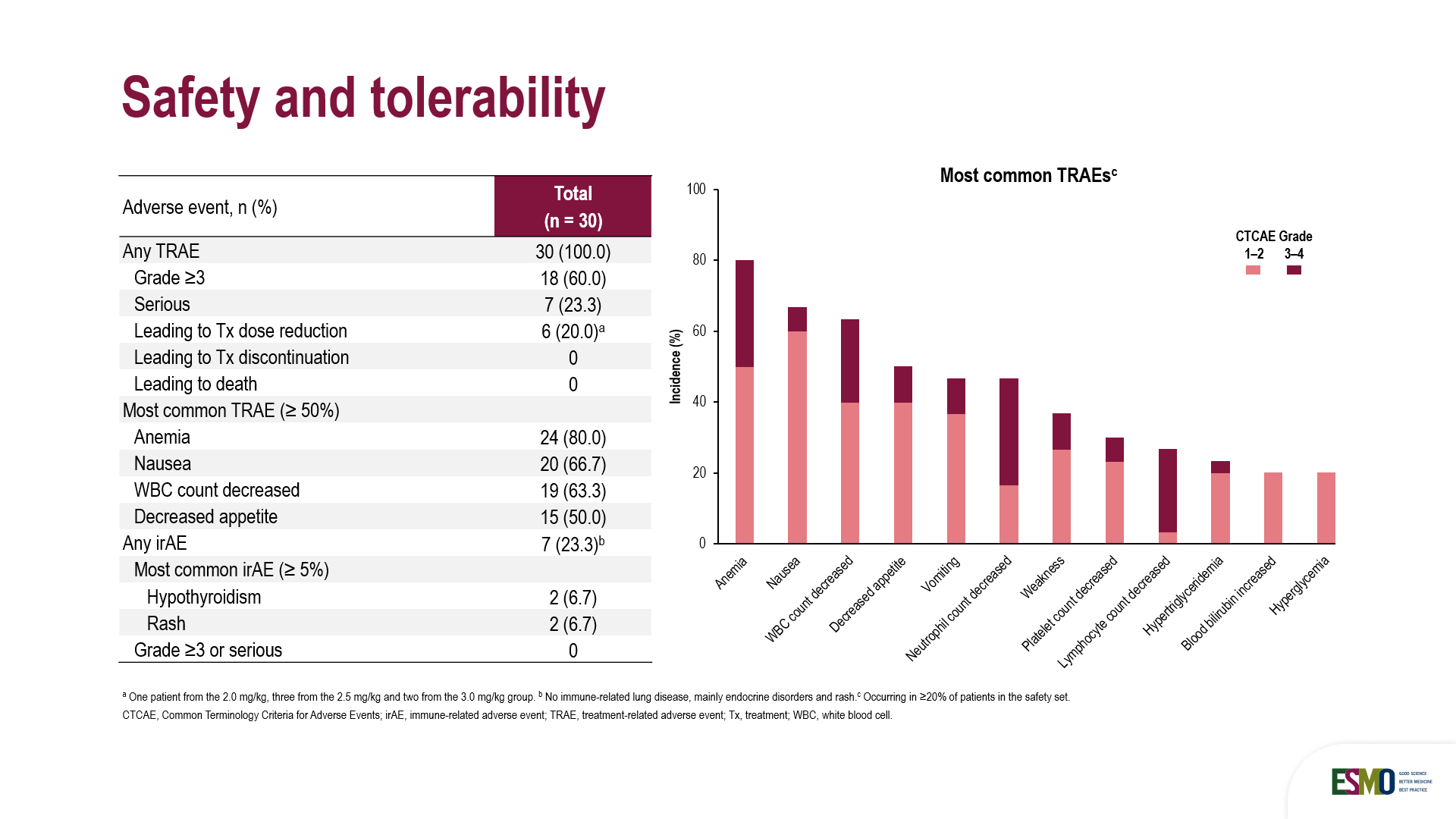 安全性方面,18列(60.0%)患者报告了≥3级治疗相关不良事件,主要为可管理的血液学毒性,常见包括为中性粒细胞计数降低(30.0%)、贫血(30.0%)和淋巴细胞计数降低( 23.3%),6例(20.0%)患者因TRAE导致剂量减少,无TRAE导致的患者停止治疗(导致停药的TRAE发生率为0%),且无TRAE导致的死亡。其中,7例(23.3%)患者发生免疫相关不良事件(irAE),主要包括甲状腺功能减退症等内分泌异常、皮疹等。无患者报告≥3级免疫相关不良事件(irAE),提示了HLX43的IO疗效,且免疫相关毒性温和,具有可控的安全性特征。