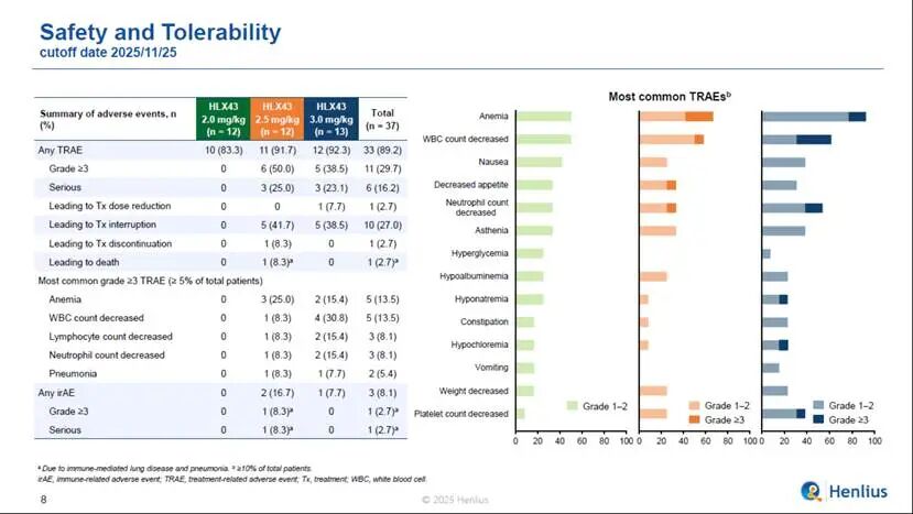 安全性方面,33例患者(89.2%)发生了治疗相关不良事件(TRAEs),其中11例患者(29.7%)报告了≥3级TRAEs,最常见的≥3级TRAEs(发病率≥5%)包括贫血(13.5%)、白细胞计数下降(13.5%)、淋巴细胞计数降低(8.1%)、中性粒细胞计数降低(8.1%)、肺炎(5.4%)等。TRAEs导致1例(2.7%)患者用药剂量减少,1例(2.7%)患者永久停药,1例患者死亡。其中,在疗效信号更为显著的3mg/kg剂量组中,HLX43安全性良好,5例患者(38.5%)报告了≥3级TRAEs,1例患者(7.7%) 因TRAEs导致用药剂量减少,无患者(0%)因TRAE导致永久停药或死亡。