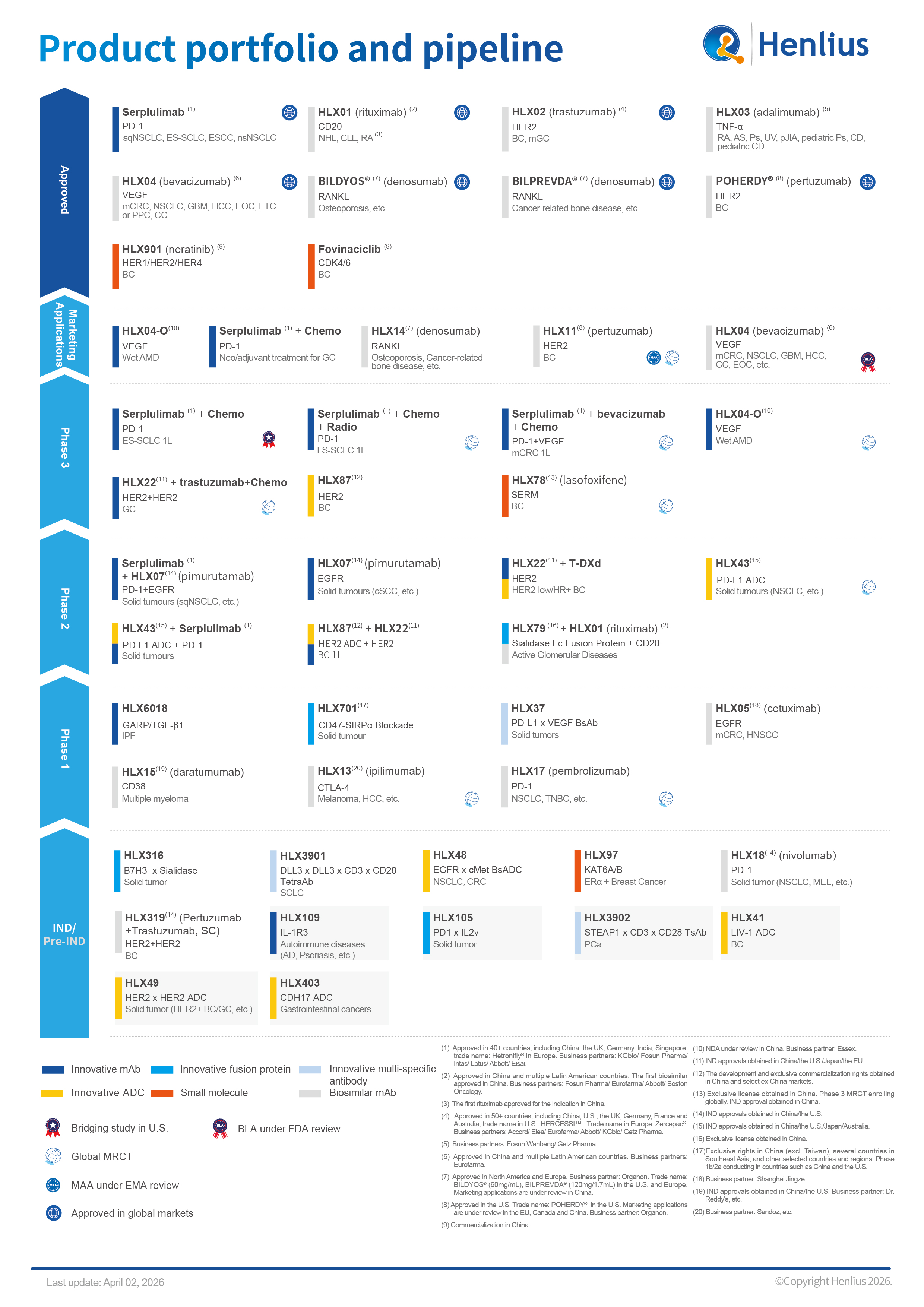 At present, Henlius has 10 products have been approved for marketing worldwide, and 6 marketing applications under review in China, the U.S. and the EU, respectively.  Meanwhile, Henlius has conducted over 30 clinical studies for 19 products globally. To date, Henlius has launched products include HANSIZHUANG (serplulimab, trade name: Hetronifly® in Europe), the world’s first anti-PD-1 mAb for the first-line treatment of SCLC, HANQUYOU (trastuzumab, trade name: HERCESSI™ in the U.S., Zercepac® in Europe), a China-developed mAb biosimilar approved in China, Europe and U.S., HANLIKANG (rituximab), the first China-developed biosimilar, denosumab Bildyos® and Bilprevda®, and pertuzumab Poherdy®.
