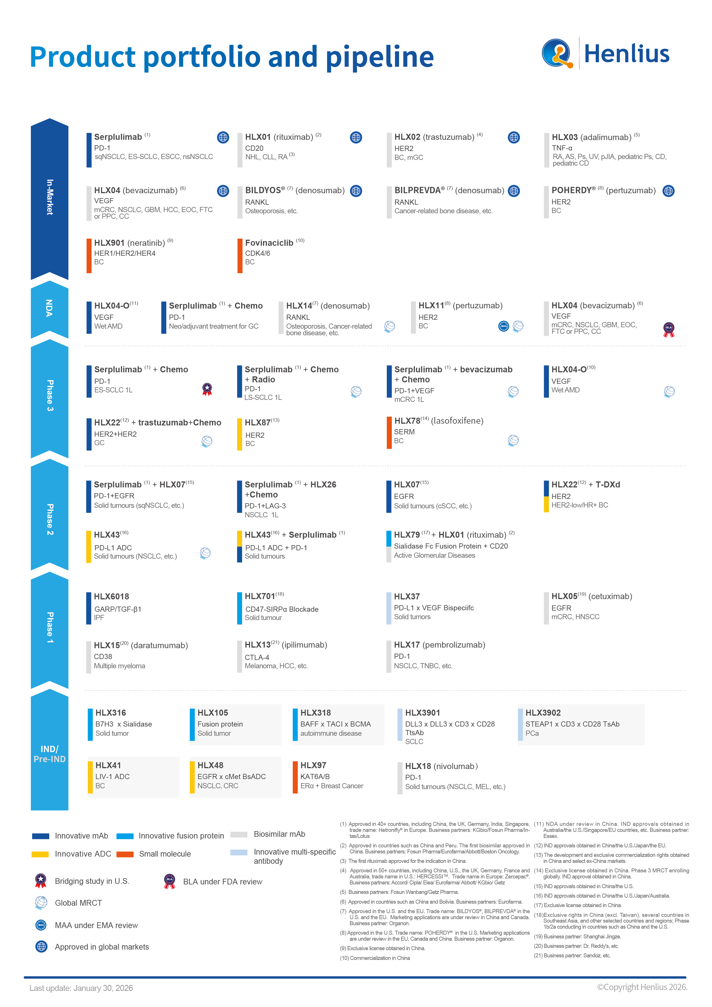 At present, Henlius has 10 products have been approved for marketing worldwide, and 6 marketing applications under review in China, the U.S. and the EU, respectively.  Meanwhile, Henlius has conducted over 30 clinical studies for 19 products globally. To date, Henlius has launched products include HANSIZHUANG (serplulimab, trade name: Hetronifly® in Europe), the world’s first anti-PD-1 mAb for the first-line treatment of SCLC, HANQUYOU (trastuzumab, trade name: HERCESSI™ in the U.S., Zercepac® in Europe), a China-developed mAb biosimilar approved in China, Europe and U.S., HANLIKANG (rituximab), the first China-developed biosimilar, denosumab Bildyos® and Bilprevda®, and pertuzumab Poherdy®.
